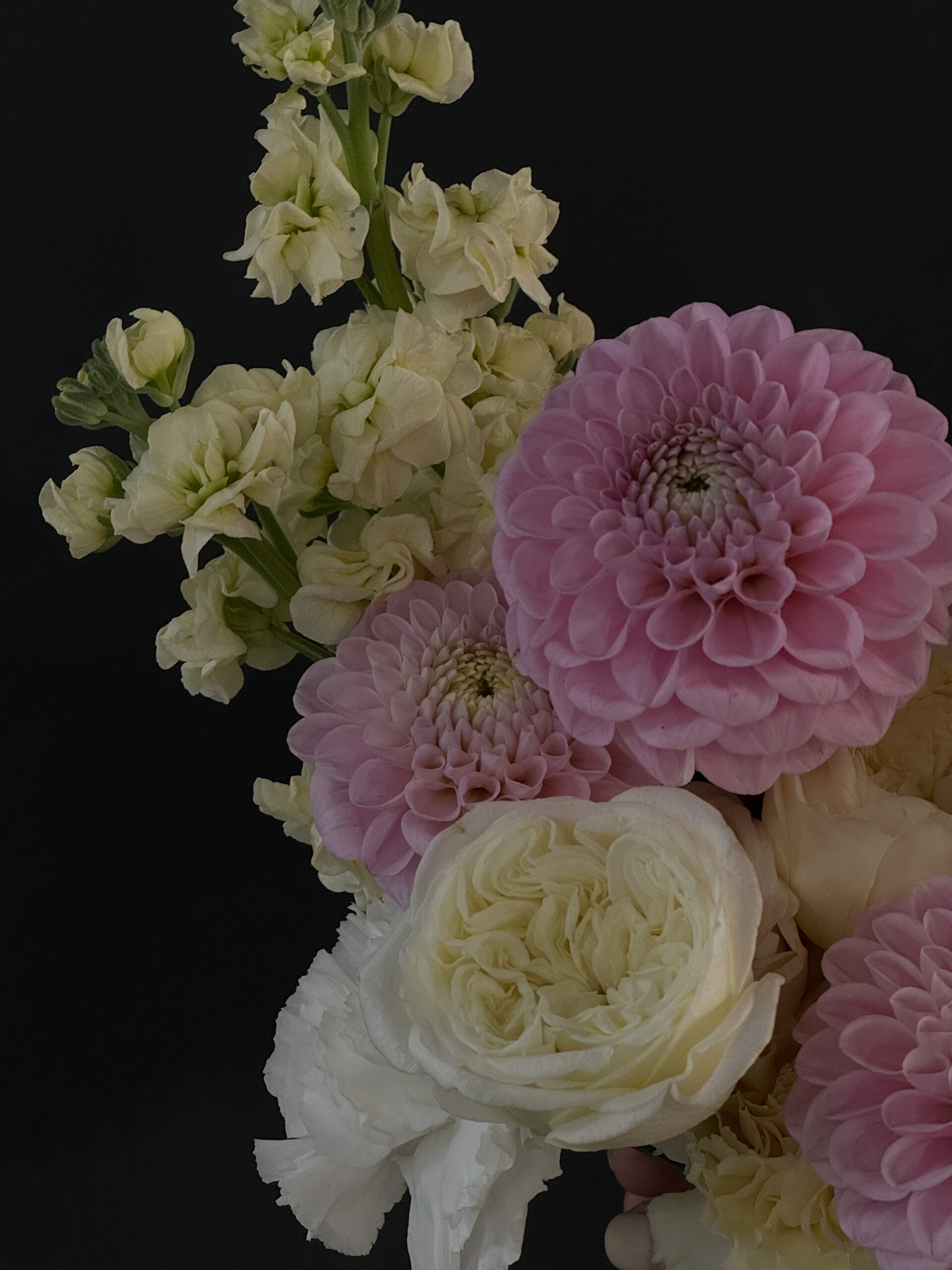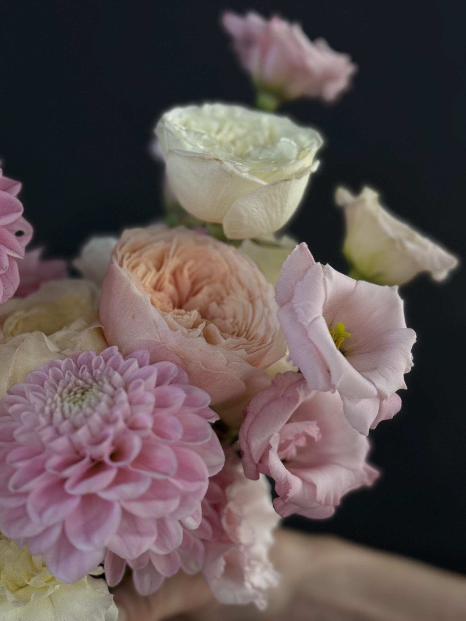 Букет выглядит нежно, элегантно и с лёгким акцентом на индивидуальность. Он сочетает в себе классическую романтику и современные флористические штрихи. Пышные розы создают основу, маттиола и эустома добавляют воздушности, диантусы — текстурную глубину, а орхидея и амарант — изысканность и характер. Композиция сбалансирована, визуально лёгкая, но при этом насыщенная по настроению.