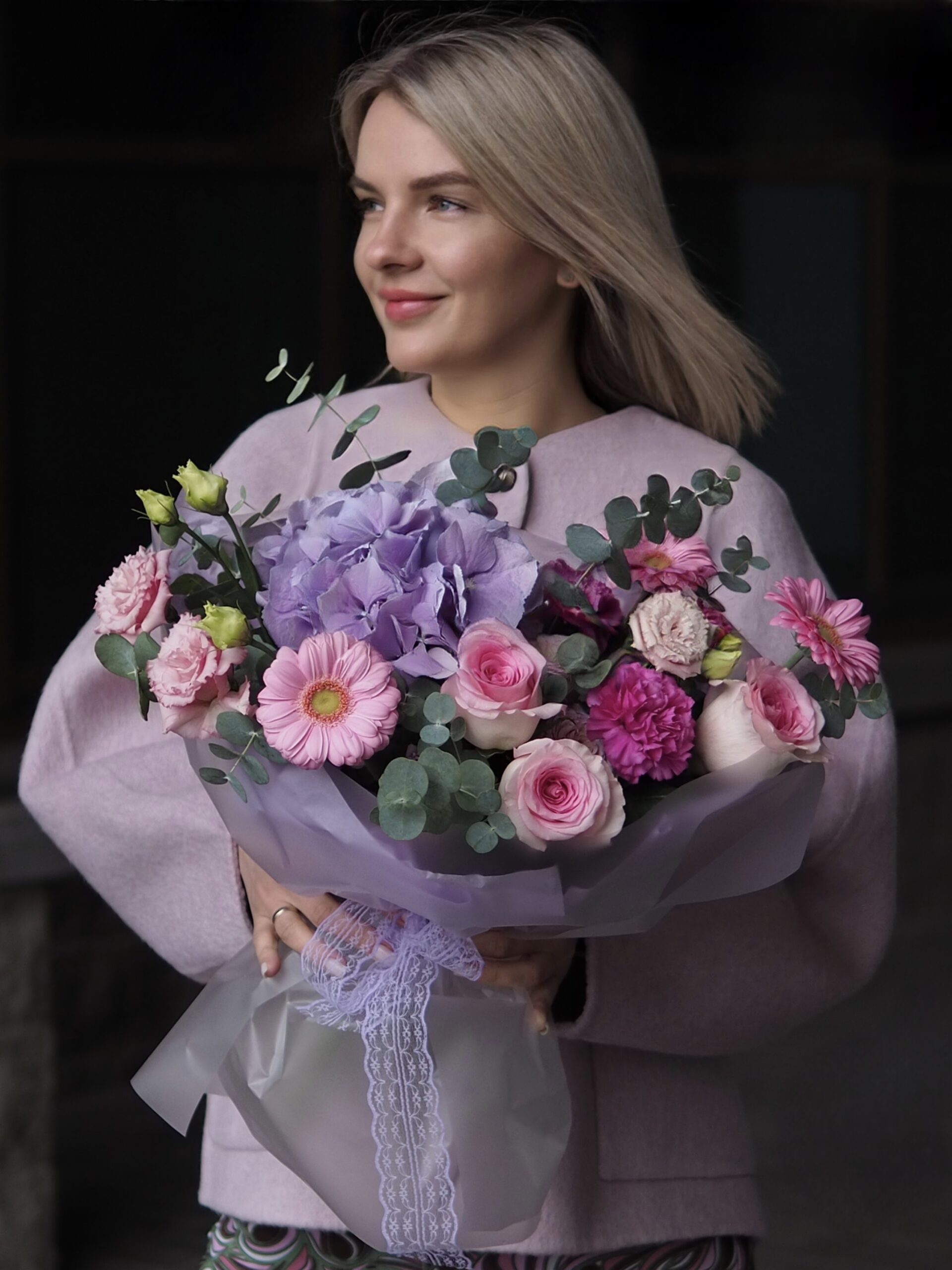 Стильная цветочная композиция с крупными гортензиями, утончёнными розами и яркими мини-герберами. Эвкалипт и эустома добавляют свежести и воздушности, а диантус завершает образ, придавая букету неповторимую структуру.