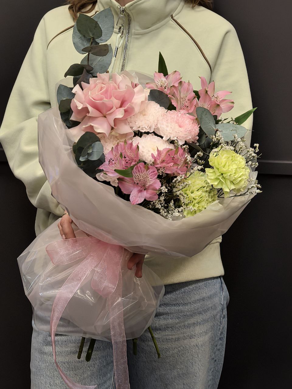 Сочетание нежных розовых и изумрудно-зеленых оттенков, дополненное ароматными веточками эвкалипта, создает неповторимый букет, который будет радовать глаз и душу.