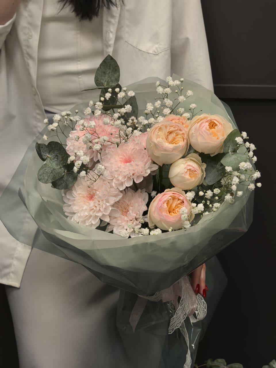 Этот букет словно легкое облако, сотканное из самой утонченной красоты природы. Он пробуждает в сердце тепло и умиротворение, как ласковый весенний бриз, несущий запах цветущего сада.
