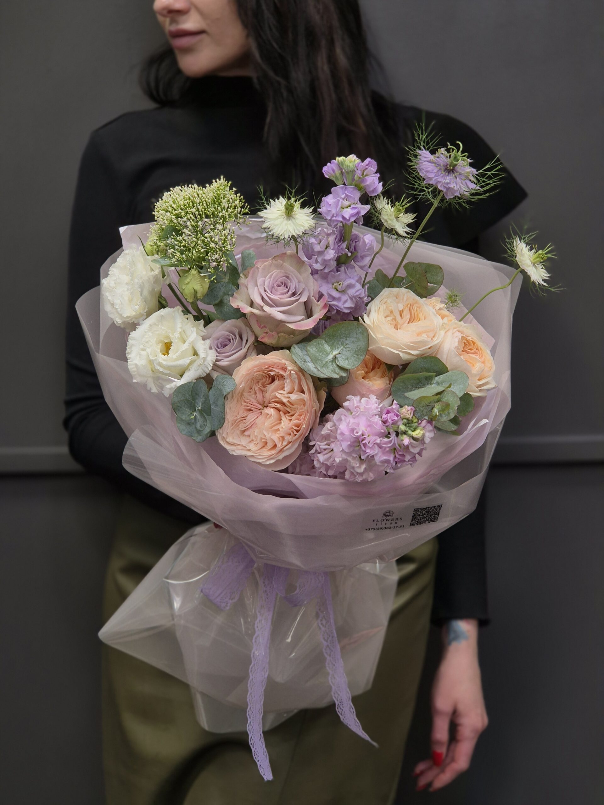 Этот изысканный букет—настоящая симфония нежности и элегантности. Пионовидные розы очаровывают своей пышностью и аристократичным шармом, маттиола дарит тонкий, сладковатый аромат, а эустома дополняет композицию воздушностью и романтикой. Прекрасный выбор для особенного случая или просто чтобы выразить чувства без лишних слов.