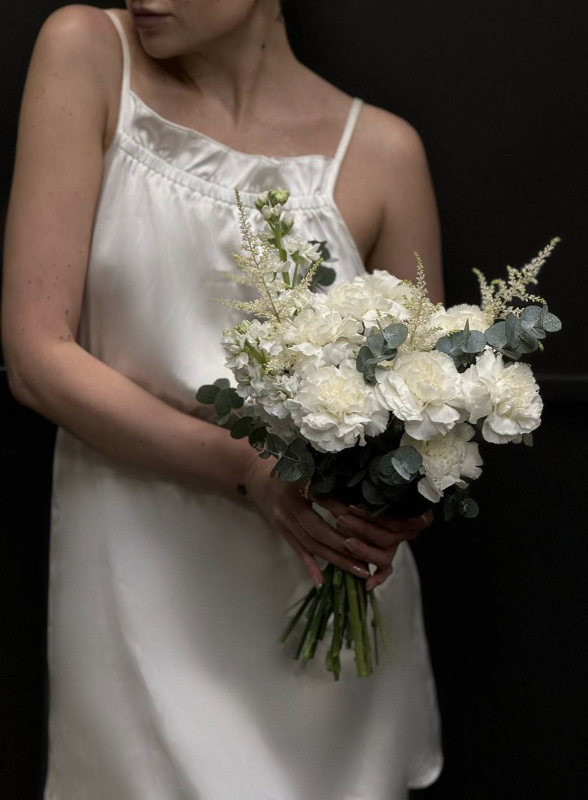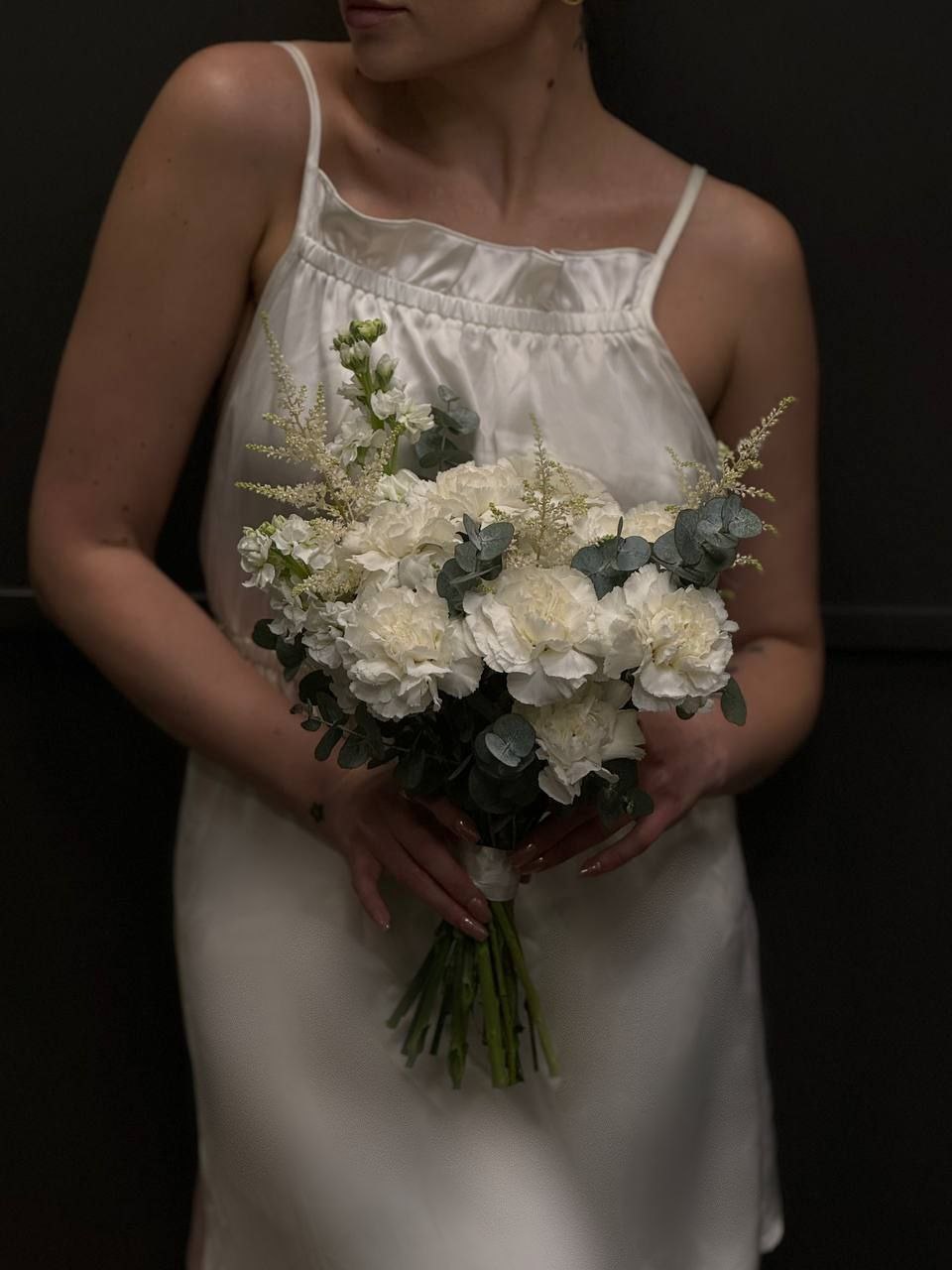 Этот букет — как утренний шёпот сада, собранный в изящную композицию. Диантусы создают плотную, бархатистую основу, словно мягкое облако, в которое хочется погрузиться. Маттиола добавляет вертикаль и аромат, астильба — воздушную текстуру, похожую на лёгкий туман, а эвкалипт завершает образ зелёными штрихами, придавая букету дыхание природы. Композиция выглядит утончённо, но с характером — как тихая уверенность, обрамлённая нежностью.
