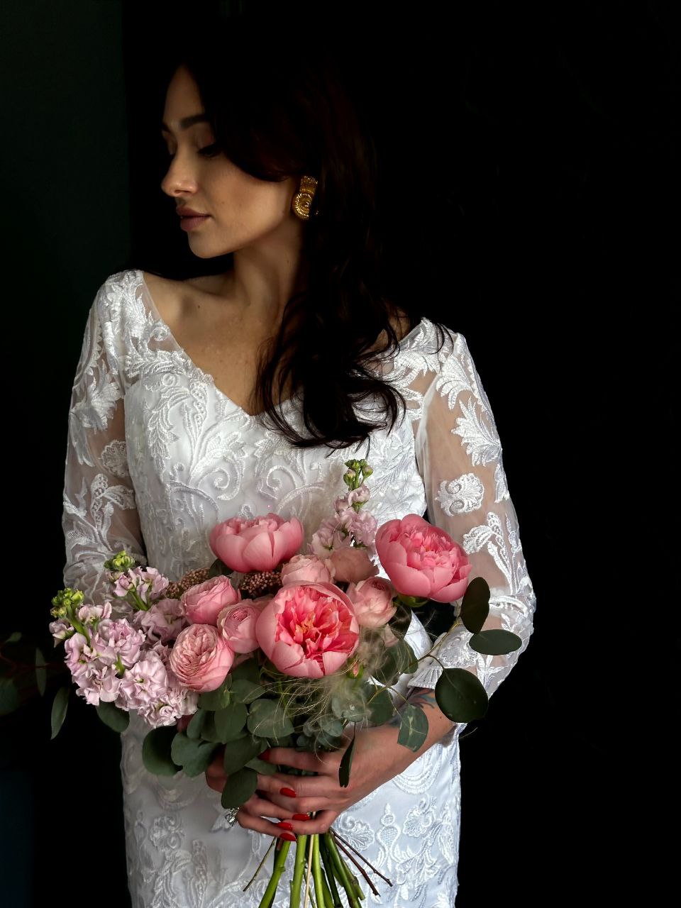 Он словно собран из утренней нежности и лёгкого дыхания сада, где всё живёт в ритме тишины и света. Он выглядит естественно, но не просто — в его форме есть продуманная лёгкость, как будто он сам вырос в руках невесты. Объёмный, но не тяжёлый, он будто создан для того, чтобы быть частью момента, а не просто украшением. Его структура — мягкая, воздушная, с лёгкими акцентами, которые не спорят друг с другом, а дополняют. Это букет, который не требует внимания — он его получает просто тем, что есть.
