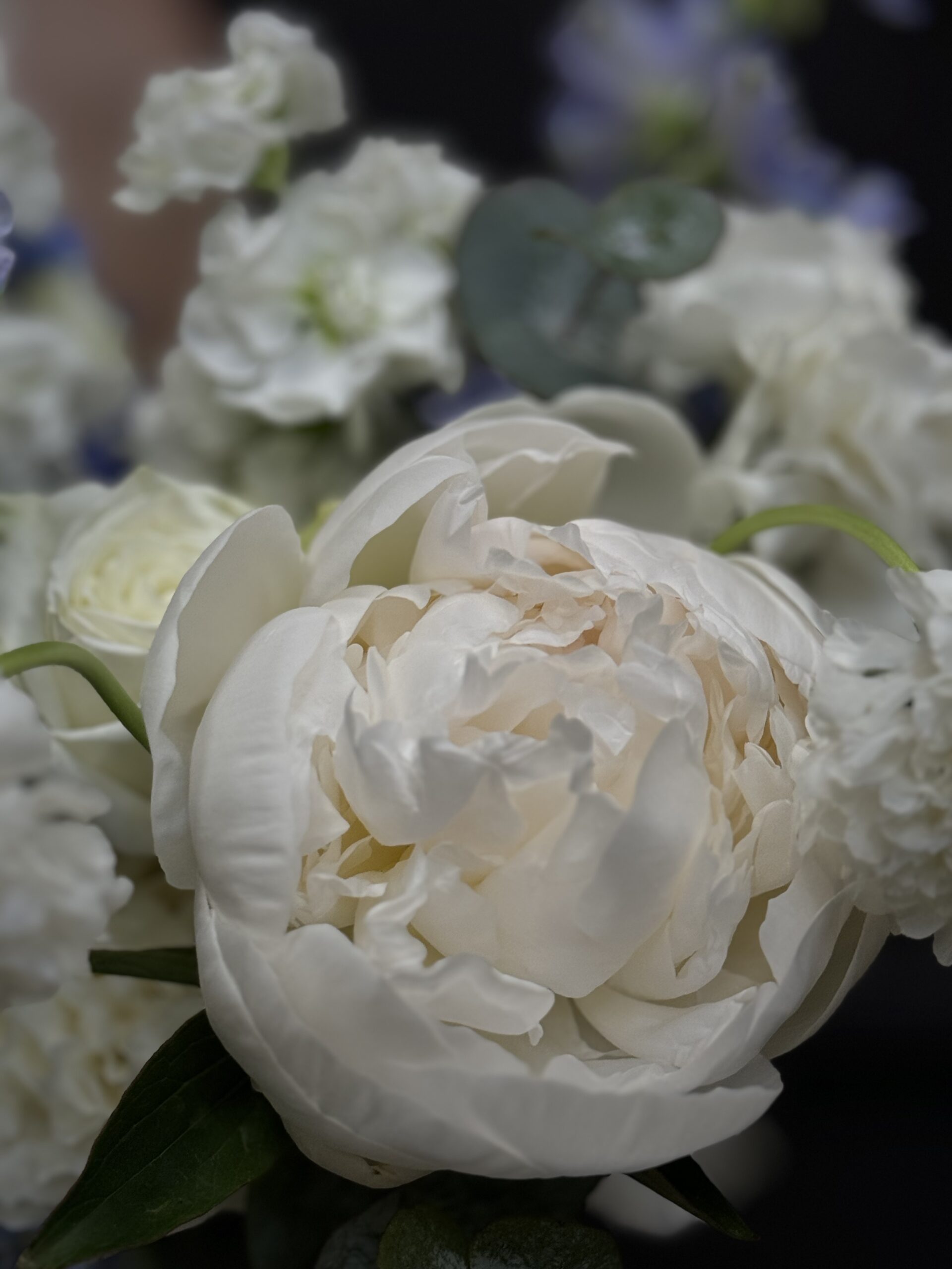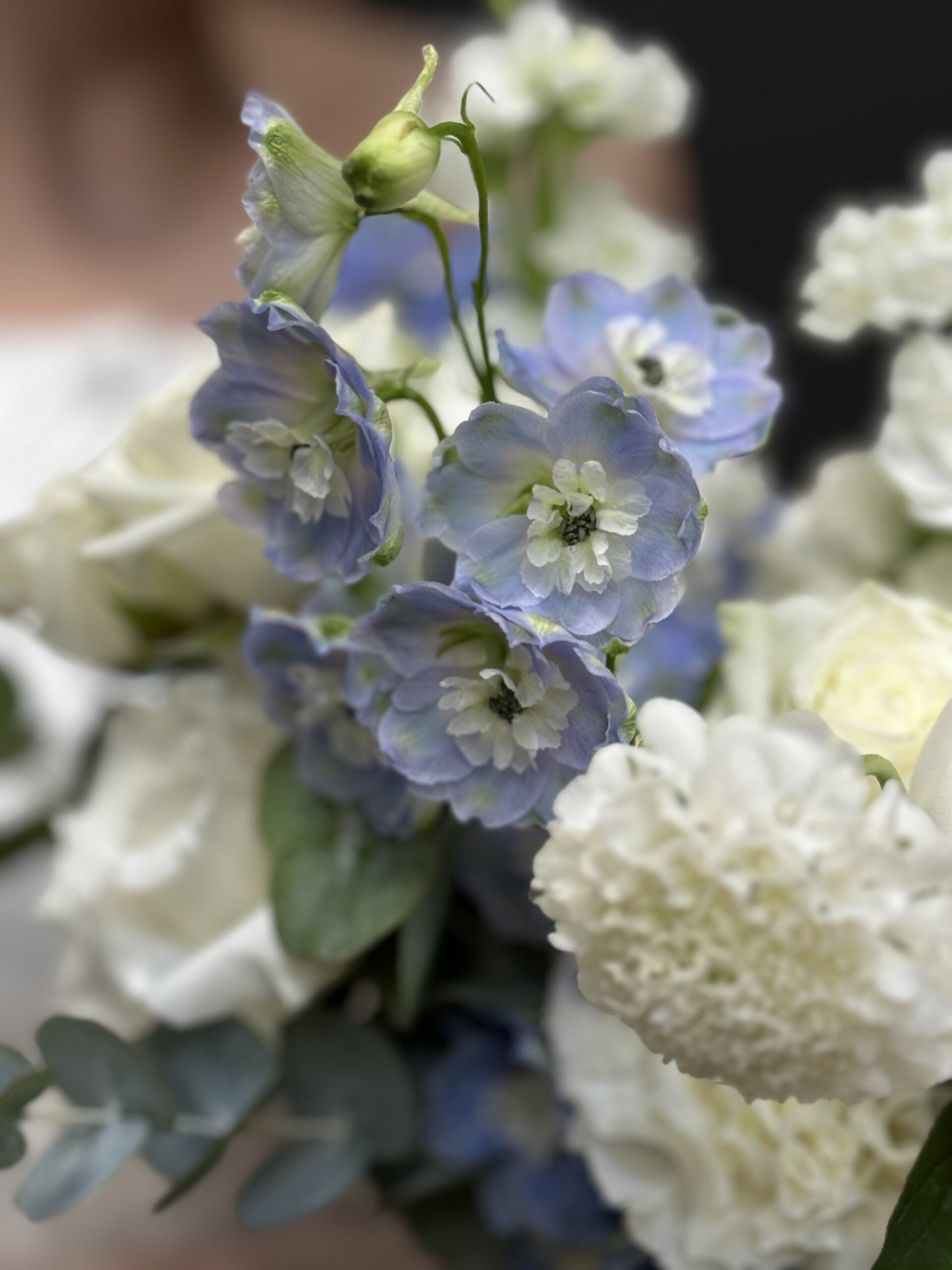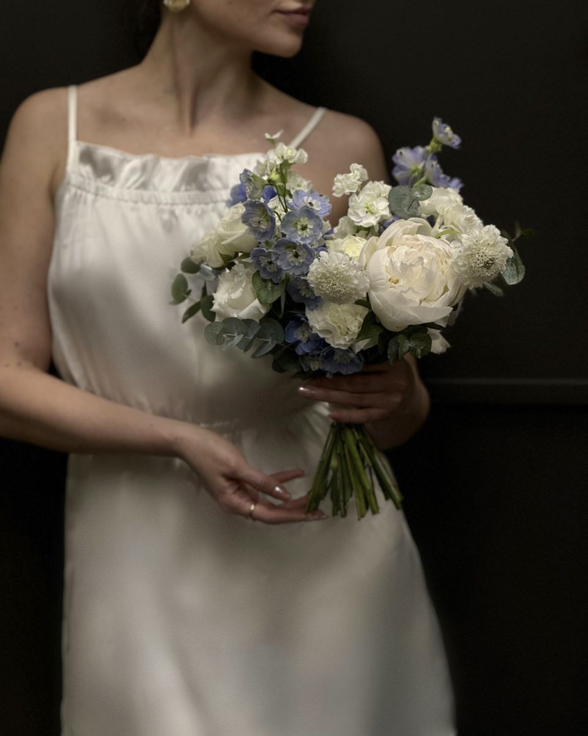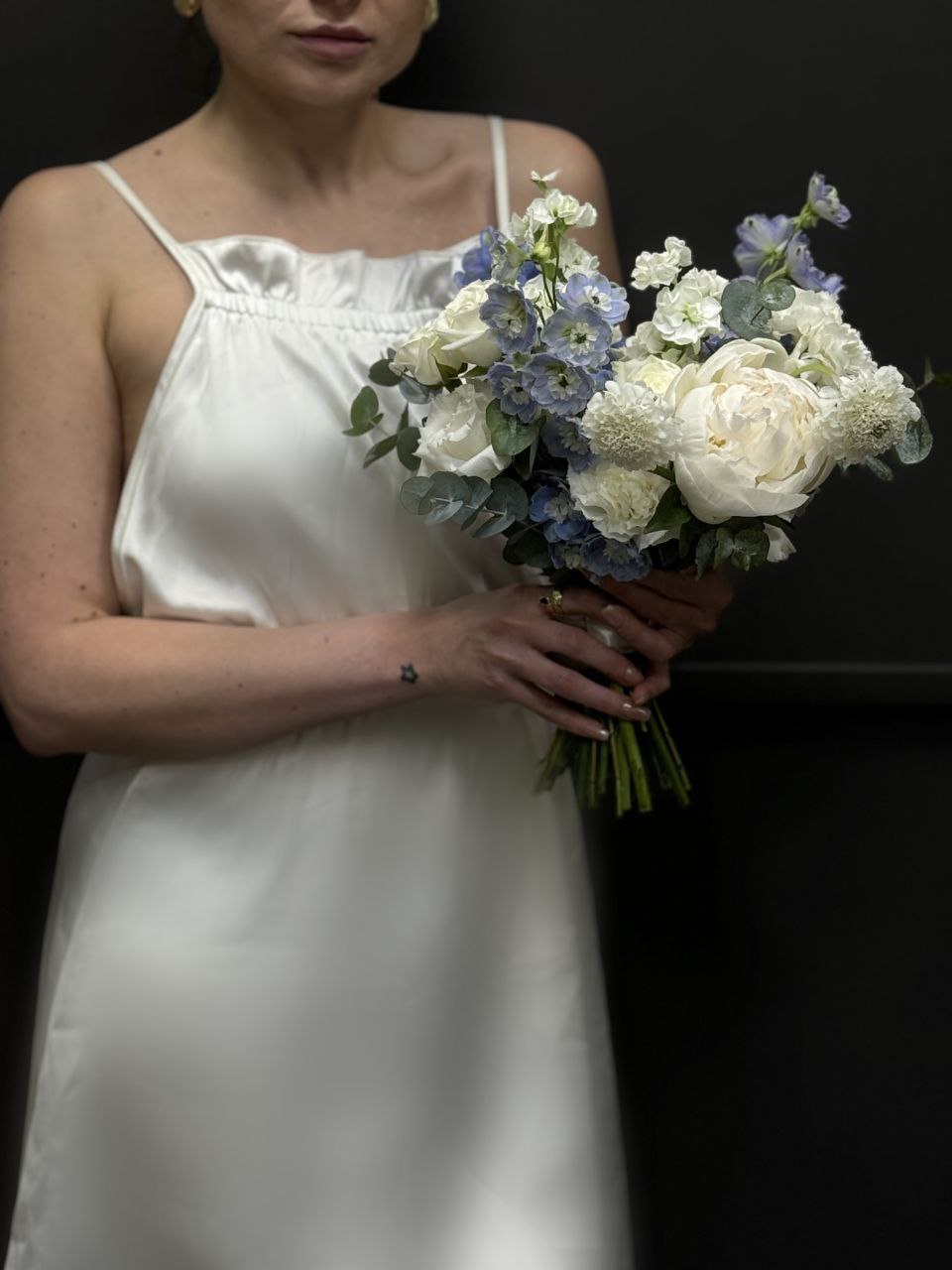 Этот свадебный букет — как дыхание утреннего сада, собранное в ладони. Он многослойный, живой, с естественной асимметрией и лёгкой динамикой. Высокие дельфиниумы придают вертикаль и изящество, пион — мягкость и роскошь, кустовая роза — камерность и уют, маттиола — аромат и текстуру, а эвкалипт завершает композицию лёгкой зелёной дымкой. Букет выглядит как будто его собрали на рассвете, не по правилам, а по вдохновению.