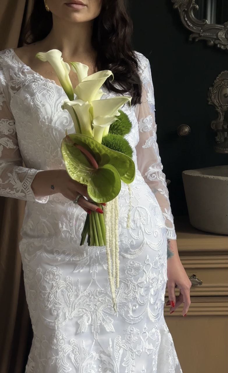 Этот свадебный букет — смелая и элегантная композиция, в которой сочетаются скульптурные формы, изящные линии и выразительная текстура. Он выглядит как современное произведение флористического искусства: продуманный, графичный, с лёгкой драматичностью. Его силуэт вытянутый, динамичный, с акцентом на вертикаль и движение. Букет не перегружен, но насыщен — в нём чувствуется характер, стиль и внутренняя сила.