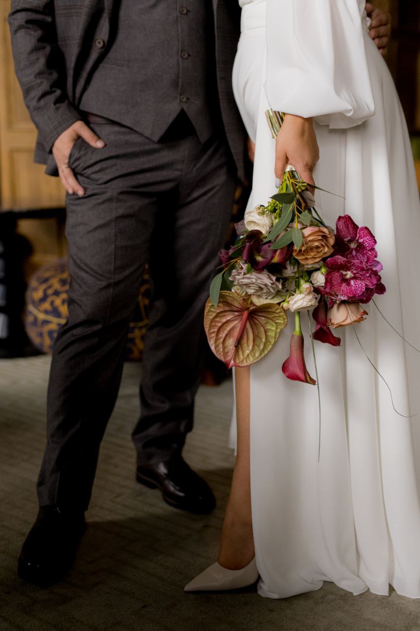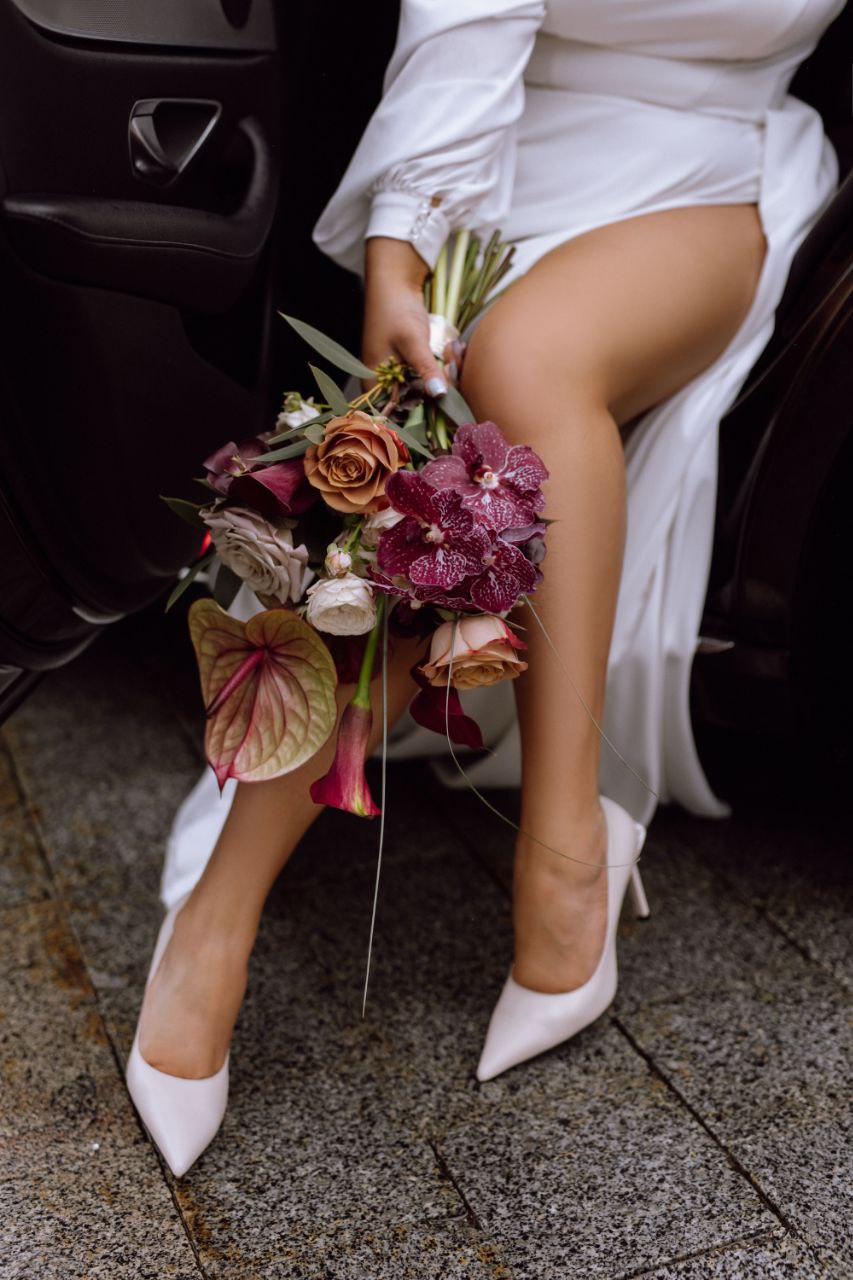 Никакой нежной невинности и пастельных штампов. Этот букет — смелое «да» страсти, характеру и индивидуальности. Он говорит громко: «Я не боюсь быть собой. Я знаю, чего хочу. И этот день — мой.»