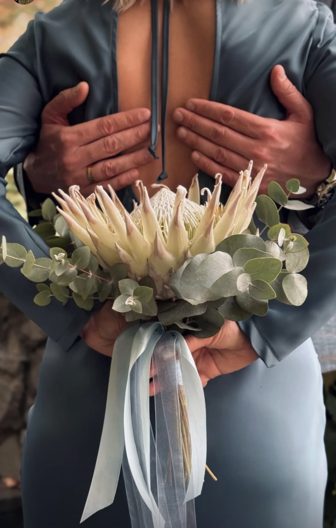 Этот свадебный букет – настоящий шедевр для ценителей оригинальности и утончённого стиля. Его главная звезда – величественная протея, символизирующая силу, редкую красоту и экзотичность. В сочетании с воздушной зеленью эвкалипта , она создаёт динамичный и необычный образ, который притягивает взгляды.